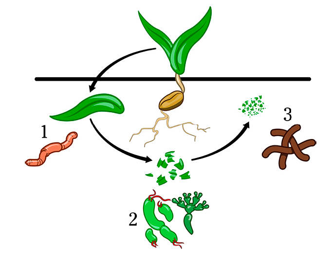 2. Bacteriën en schimmels zetten de afbraak in fases voort. De laatste fase genaamd mineralisatie, is de vorming van simpele eindproducten die beschikbaar zijn voor planten (bijvoorbeeld: nitraat, fosfaat en sulfaat).