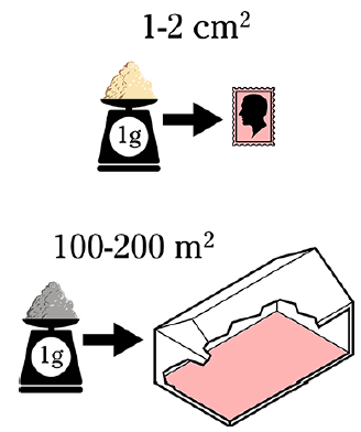 In perspectief; Een gram zand heeft bijvoorbeeld een gecombineerd oppervlak van ongeveer 1,5 - 2 cm2, wat overeenkomt met een postzegel. Een gram klei kan echter een gecombineerd oppervlak van meerdere 100 m2 hebben - een huis van gemiddelde grootte.