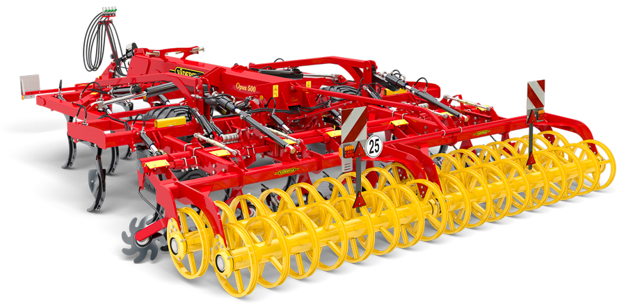 De wielen bevinden zich in het midden van de machine, waardoor de Opus gemakkelijk te vervoeren is en een kleine draaicirkel heeft op de kopakker. Achter elk wiel zit een tand om een bewerking zonder sporen achter te laten. Steunwielen op de vleugelsecties zorgen ervoor dat de cultivator over de gehele werkbreedte op een constante diepte werkt.