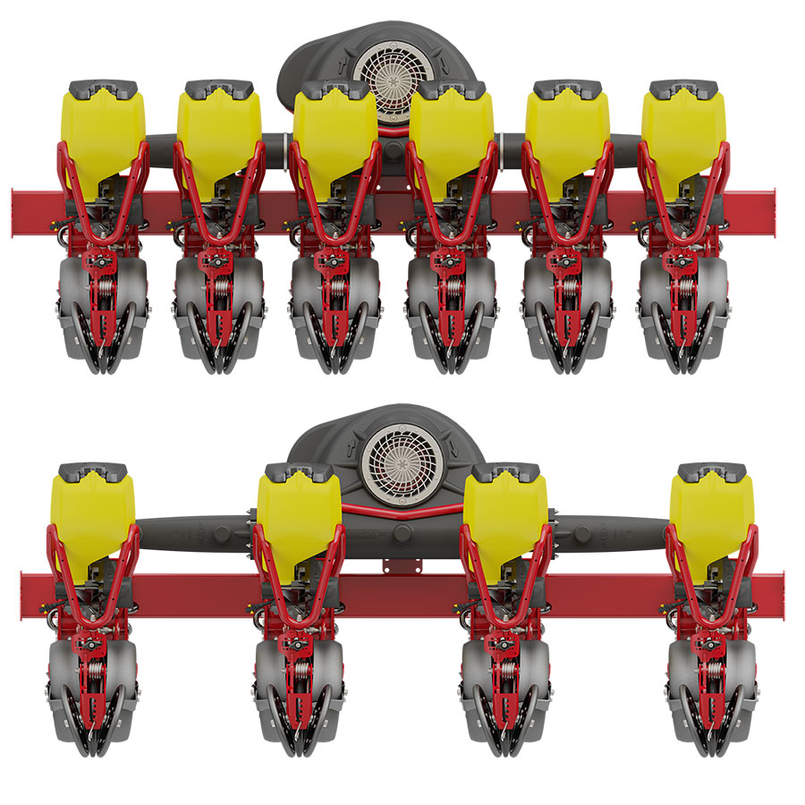 Met zes rijen kan de machine worden geconfigureerd tot 450 of 500 mm rijafstand, terwijl de versie met vier rijen kan worden aangepast naar 700, 750, 762 of 800 mm.