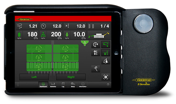 Het iPad-gebaseerde besturingssysteem Väderstad E-Control levert draadloos een uitgebreide controle en bewaking van het zaaiproces tijdens het rijden op het veld. Bovendien profiteert u van gebruiksvriendelijke installatie en kalibratie op afstand