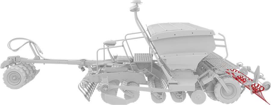 De twee rijen gezaaide zaden en één rij kunstmest het er achterlopende packerwiel drukt de grond stevig aan. Zo komt het gezaaide zaad in contact met bodemvocht en schept zo de optimale omstandigheden voor ontkieming.