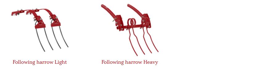 De volgende eg wordt geplaatst om tussen de rijen zaad te lopen, dus er is geen risico op verstoring van ondiep gezaaide zaden. De volgende eg maakt een losse verdampingsbarrière om vocht te behouden en voorkomt afdekken na zware regen.