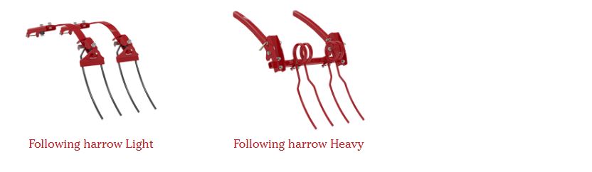 De volgende eg wordt geplaatst om tussen de rijen zaad te lopen, dus er is geen risico op verstoring van ondiep gezaaide zaden. De volgende eg maakt een losse verdampingsbarrière om vocht te behouden en voorkomt afdekken na zware regen.