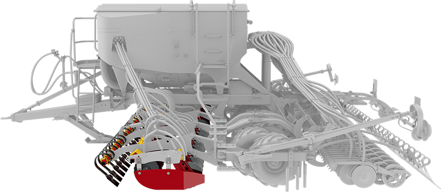 De spreidplaten verdelen het zaad gelijkmatig voor de zaaiaggregaten, waar het wordt bedekt door een stroom van grond rond de zaaischijven en door het perswiel.